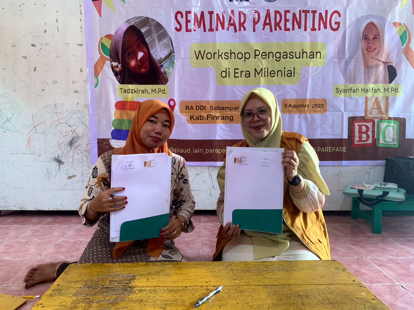 Humas IAIN Parepare- Tim dosen dan mahasiswa Prodi Pendidikan Islam Anak Usia Dini (PIAUD) IAIN Parepare menggelar Workshop Pengasuhan yang bertajuk "Kekerasan Seksual pada Anak Usia Dini" di Raudhatul Atfal (RA) DDI Sabamparu, Kec. Suppa, Pinrang pada, Sabtu (05/08/2023). Kegiatan ini diikuti oleh 50 orang yang terdiri dari, guru, orang tua siswa, dan masyarakat sekitar.