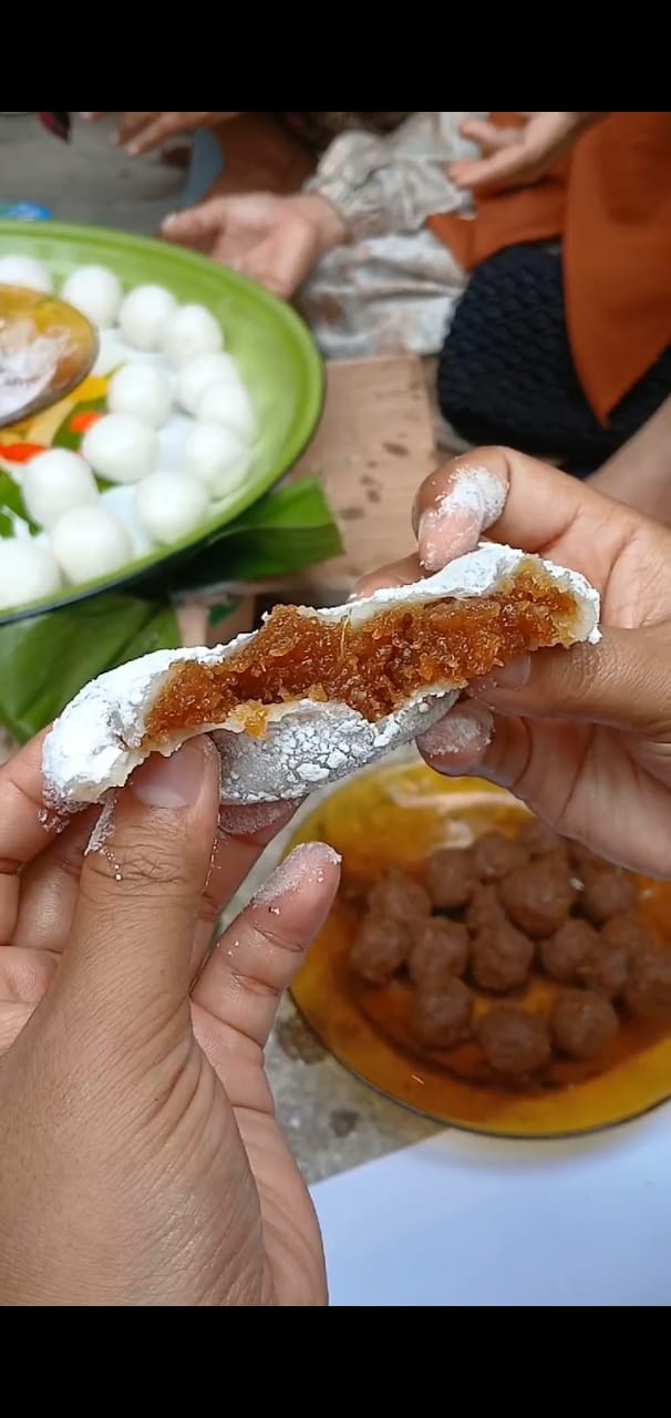 Selanjutnya, untuk bahan isi, campurkan kelapa parut dengan air dan gula pasir, lalu masak hingga menjadi kental. Ambil adonan bulat-bulat sesuai selera, isi dengan bahan isi kelapa dan gula merah, lalu bulatkan kembali.