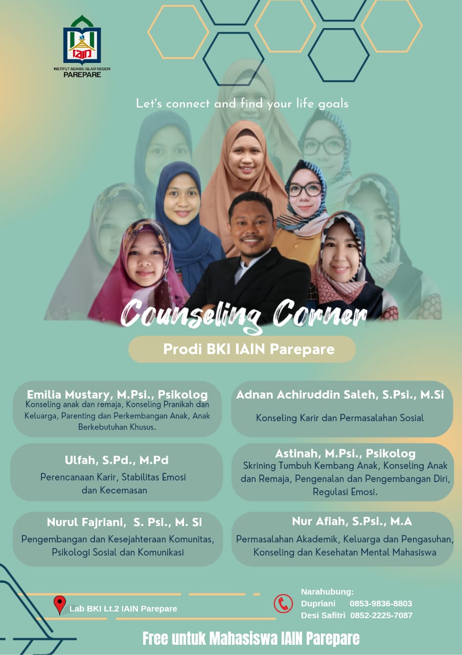 Humas IAIN Parepare - Laboratorium Program Studi Bimbingan Konseling Islam (BKI) adalah fasilitas penunjang bagi mahasiswa dalam proses belajar di Prodi BKI dan sebagai sarana pengabdian kepada masyarakat bagi dosen IAIN Parepare. Penggunaan laboratorium BKI diperuntukkan untuk kepentingan praktik dalam berbagai mata kuliah. Selain itu, juga berfungsi sebagai tempat layanan konseling. Layanan konseling BKI atau Counseling Corner sebagai sarana bagi mahasiswa dan masyarakat umum dalam mendapatkan bantuan psikologis. Sejak November 2022, Counseling Corner BKI telah melayani sesi konseling kepada 23 orang. Adapun alur layanan konseling di laboratorium BK adalah 1) calon klien menghubungi mahasiswa BKI sekaligus sebagai asisten konselor, 2) mengisi google form, 3) mengkonfirmasi konselor, lalu 4) pelaksanaan konseling di laboratorium konseling BKI sesuai jadwal yang telah disepakati.