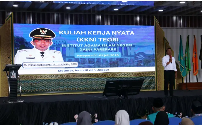 Humas IAIN Parepare--Pembekalan Kuliah Kerja Nyata (KKN) Teori IAIN Parepare memasuki hari kedua dengan nuansa istimewa. Bupati Sidenreng Rappang (Sidrap), H. Syaharuddin Alrif, S.IP., M.M., hadir langsung di kampus IAIN Parepare pada Selasa (1/7/2025) untuk memberikan motivasi dan berbagi kisah inspiratif kepada para peserta.