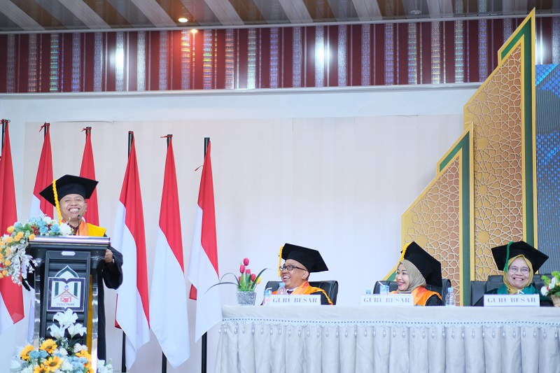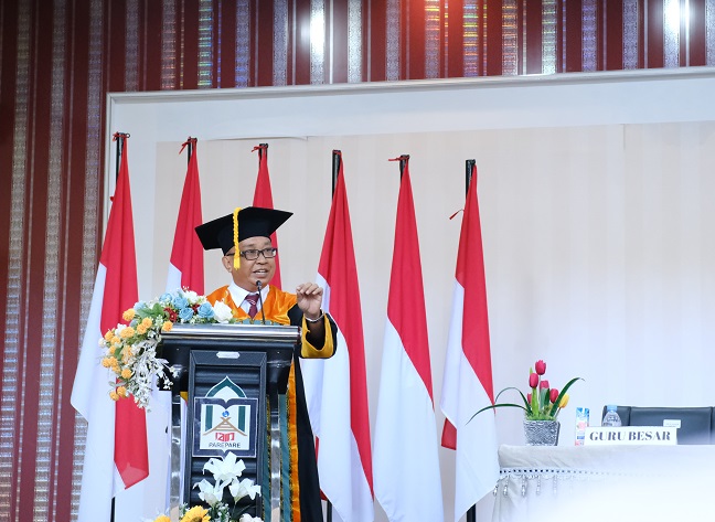 Prosesi pengukuhan ini dihadiri langsung oleh Sekretaris Jenderal Kementerian Agama RI, Prof. Dr. H. Nizar, M.Ag., Seluruh Civitas Akademik IAIN Parepare, dan tamu undangan yang tampak memenuhi gedung Auditorium IAIN Parepare.
