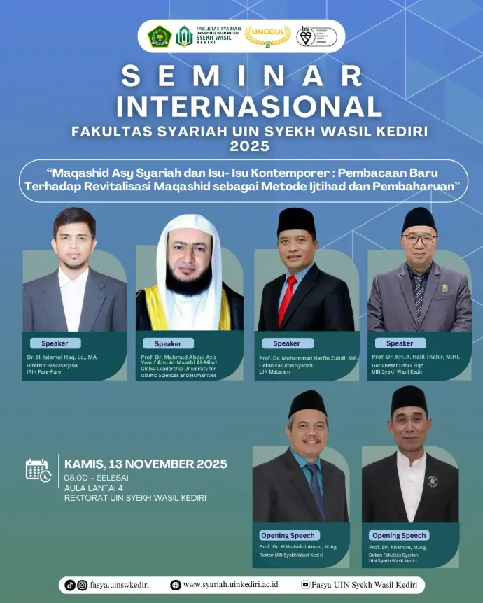 Acara bergengsi ini digelar pada hari kamis, (13/11/25) di Aula Lantai 4 Gedung Rektorat UIN Syekh Wasil Kediri dengan mengusung tema besa "Maqashid Asy Syariah dan Isu-Isu Kontemporer: Pembacaan Baru terhadap Revitalisasi Maqashid sebagai Metode Ijtihad Pembaharuan".