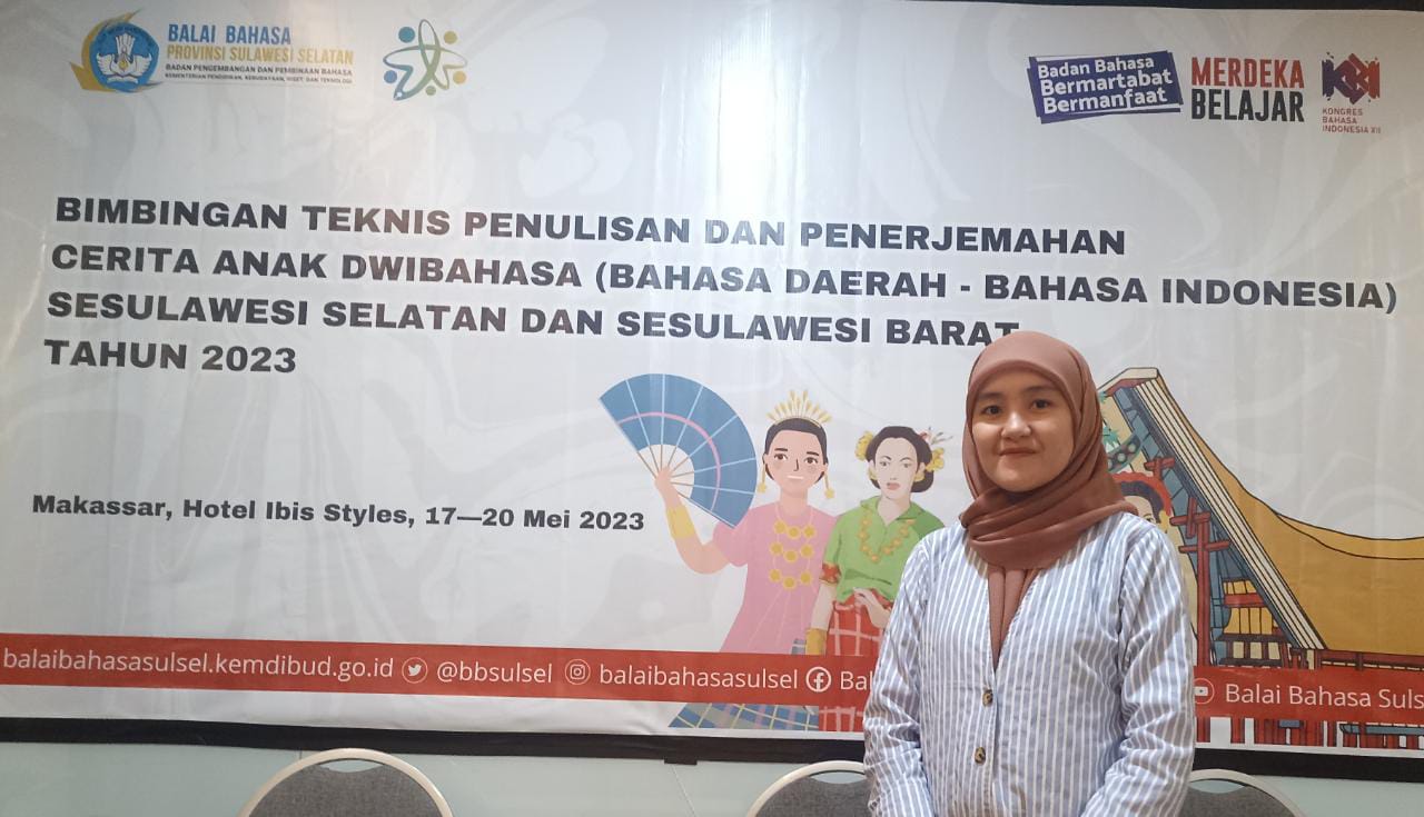 Humas IAIN Parepare - Suhartina, Dosen Tarbiyah IAIN Parepare mengikuti Bimtek Penulisan dan Penerjemahan Buku Cerita Anak Dwibahasa (Bahasa Daerah-Indonesia) se-Sulawesi Selatan dan se-Sulawesi Barat yang diadakan Balai Bahasa Provinsi Sulawesi Selatan, Rabu s.d. Sabtu (17-20/5/2023) di Hotel Ibis Style Makassar.