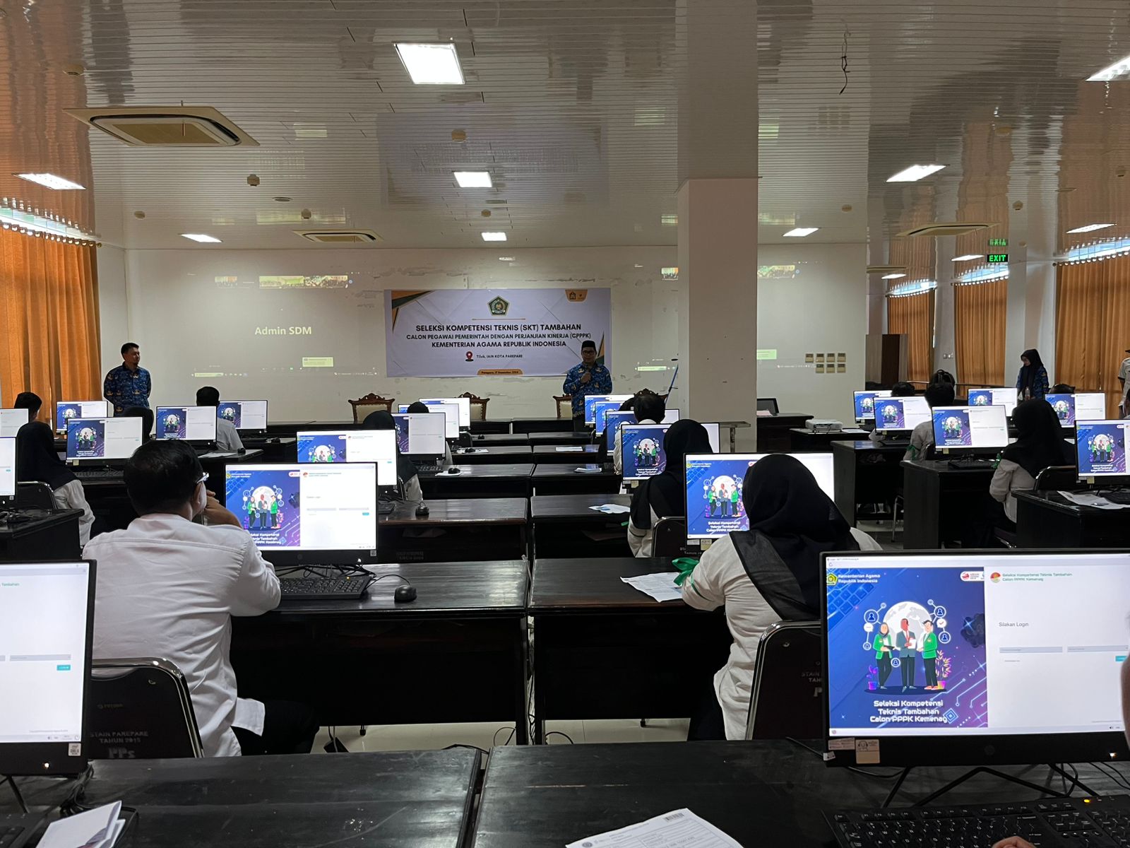 Humas IAIN Parepare—Tes Seleksi Kompetensi Teknis Tambahan (SKTT) Pegawai Pemerintah dengan Perjanjian Kerja (PPPK) Kementerian Agama (Kemenag) Tahun 2024 dilaksanakan serentak pada Selasa, 17 Desember 2024. IAIN Parepare menjadi salah satu lokasi pelaksanaan, bertempat di Gedung Perpustakaan lantai 4.