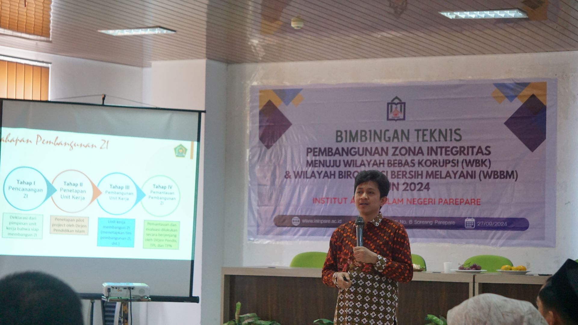 Humas IAIN Parepare—Untuk memperkuat tata kelola yang bersih dan akuntabel, Institut Agama Islam Negeri Parepare menggelar Bimbingan Teknis (Bimtek) Pembangunan Zona Integritas (ZI) menuju Wilayah Bebas dari Korupsi (WBK) dan Wilayah Birokrasi Bersih dan Melayani (WBBM). Acara ini diadakan di Gedung Perpustakaan, lantai 5, Jumat (27-09-2024) dengan menghadirkan narasumber dari Tim ZI Ditjen Pendidikan Islam, Ketua Subtim Organisasi dan Tatalaksana Ditjen Pendidikan Islam Kementerian Agama RI, Nanang Rosidi.