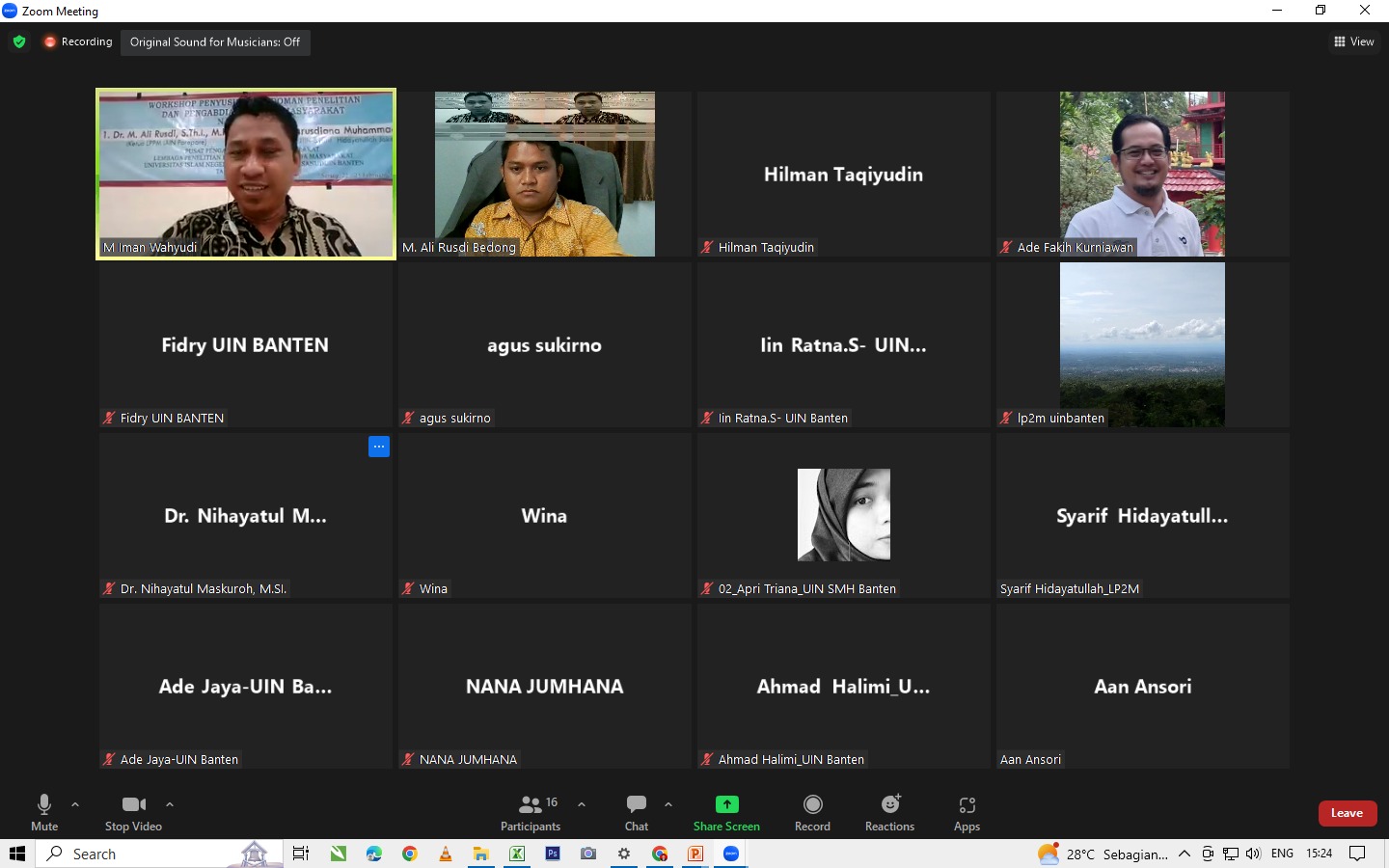 Humas IAIN Parepare--Ketua Lembaga Penelitan dan Pengabdian Kepada Masyarakt (IAIN) Parepare M. Ali Rusdi menjadi narasumber Workshop Penyusunan Pedoman Penelitian dan Pengabdian Kepada Masyarakat LP2M Universitas Islam Negeri Sultan Maulana Banten Tahun 2023, Rabu (22/02/2023) melalui Zoom Meeting.