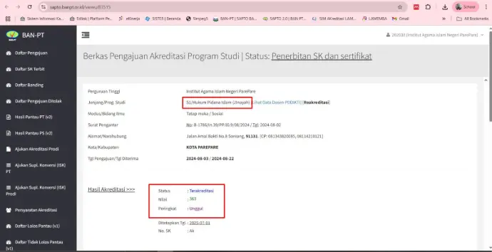 Humas IAIN Parepare--Kabar gembira menyelimuti civitas academica Institut Agama Islam Negeri (IAIN) Parepare. Program Studi Hukum Pidana Islam (HPI) secara resmi meraih Akreditasi Unggul dari Badan Akreditasi Nasional Perguruan Tinggi (BAN-PT). Informasi membanggakan ini telah tertera pada laman resmi BAN-PT sejak 1 Juli 2025, hal tersebut kembali menjadi penanda prestasi gemilang bagi IAIN Parepare.