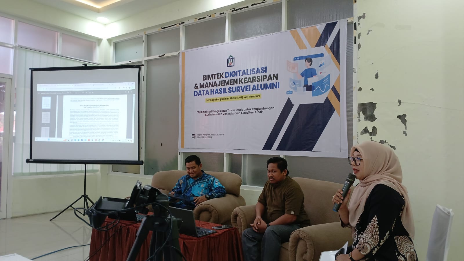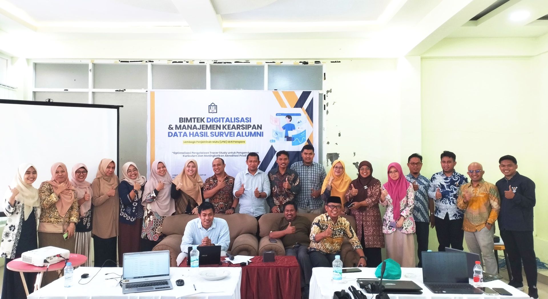 Humas IAIN Parepare_Lembaga Penjaminan Mutu (LPM) IAIN Parepare di bawah Pusat Pengembangan Mutu, Karier Mahasiswa dan Alumni menyelenggarakan Bimbingan Teknis Pelaporan Tracer Study yang bertajuk Bimtek Digitalisasi dan Manajemen Kearsipan Data Hasil Survey Alumni, Rabu s.d. Jum’at (26-27/06/2024 di Cafe Lagota Kota Parepare.