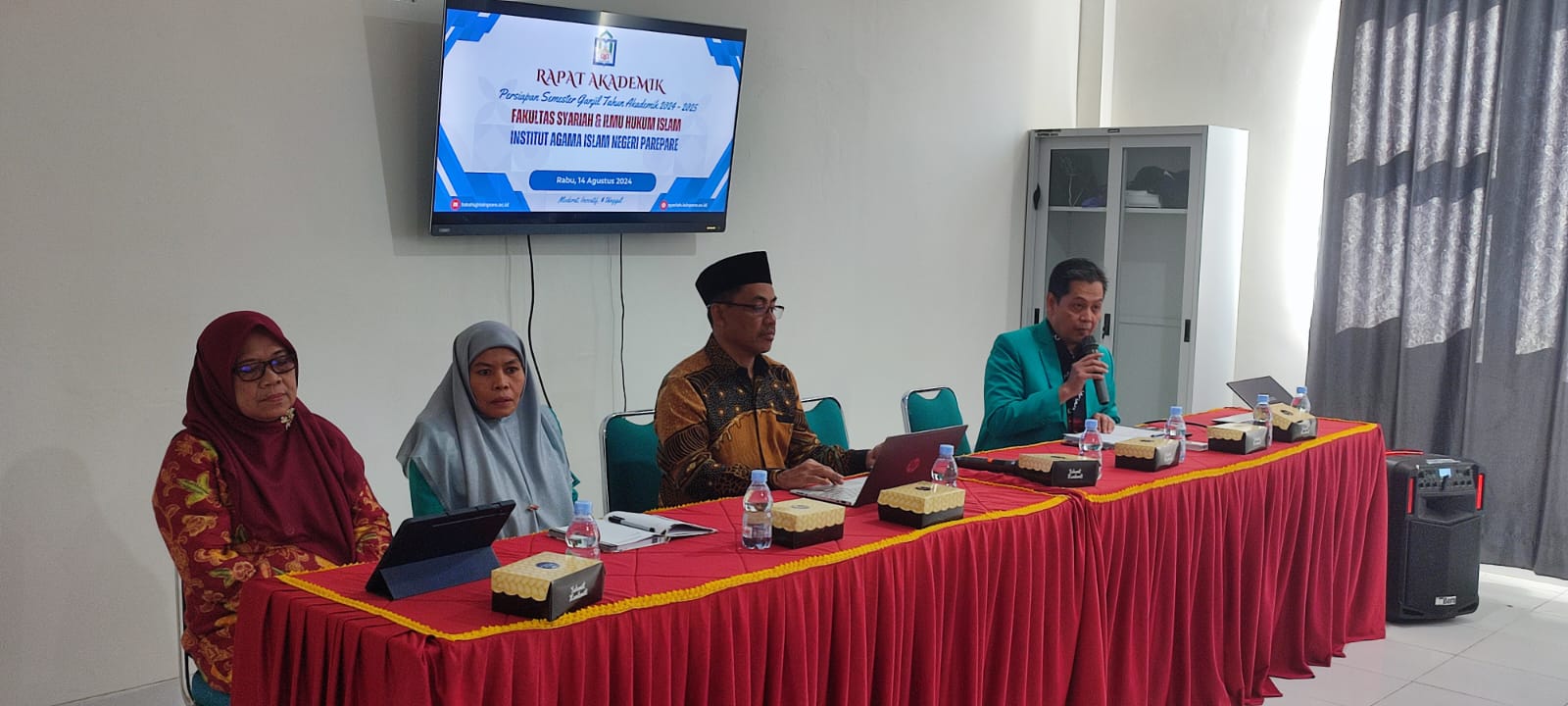 Humas IAIN Parepare_Fakultas Syariah dan Ilmu Hukum Islam (Fakshi) IAIN Parepare melaksanakan rapat akademik, Kamis, 14/08/2024 di Ruang Pertemuan Fakshi. Rapat ini dipimpin oleh Wakil Dekan I Fakshi dan dihadiri oleh Dekan Fakshi, Wakil Rektor I, Ketua LPM, Ketua Penegak Kode Etik, serta para dosen lingkup Fakshi.
