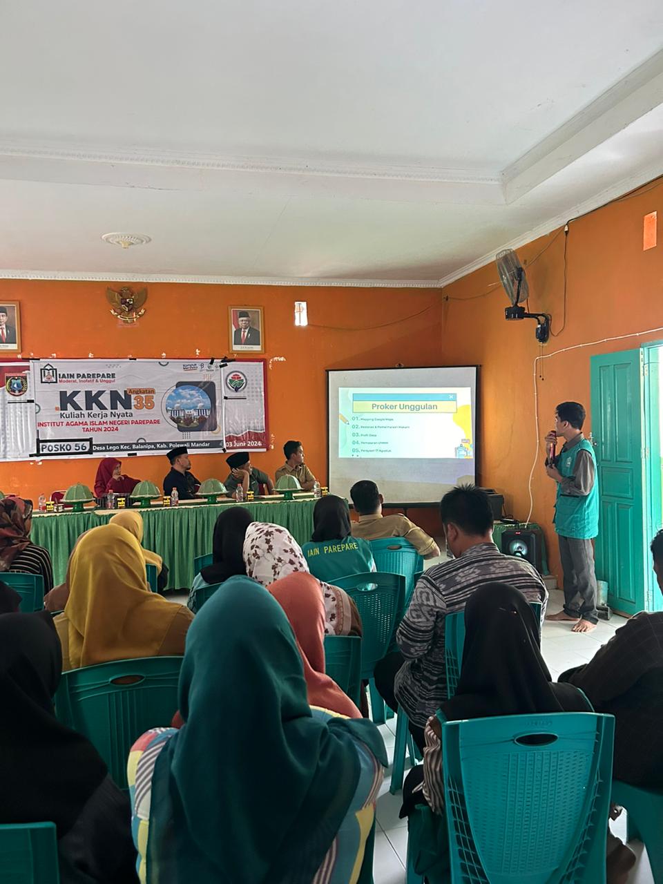 Humas IAIN Parepare---Mahasiswa KKN Posko 56 IAIN Parepare menggelar seminar program kerja di Kantor Desa Lego, Kecamatan Balanipa, Kabupaten Polewali Mandar, Sulawesi Barat, pada hari Selasa, 16 Juli 2024. Kegiatan ini dihadiri oleh Kepala Desa Lego, Asri, Dosen Pembimbing Lapangan Posko 56, Sri Muliyana, Koordinator Desa Posko 56, Nurdin Aslam, serta masyarakat Desa Lego.