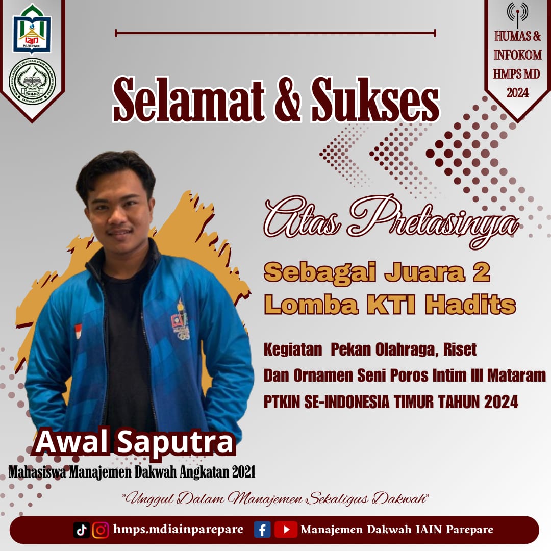 Keempat Mahasiswa tersebut yakni, Hasdiana Muin Prodi Sejarah Peradaban Islam meraih juara 3 pada ajang lomba Tenis Meja Ganda Putri dan lomba Tenis Meja Ganda Campuran, Awal Saputra Prodi Manajemen Dakwah raih juara 2 ajang lomba KTI Hadis, Muhammad Yusuf Alfa Rezki Prodi Bahasa dan Sastra Arab Juara 1 pada ajang Pidato Tausyiah serta Nurmianti Fadli Prodi Bahasa dan Sastra Arab Juara 1 pada ajang lomba Karya Tulis Ilmiah (KTI) Hadis.