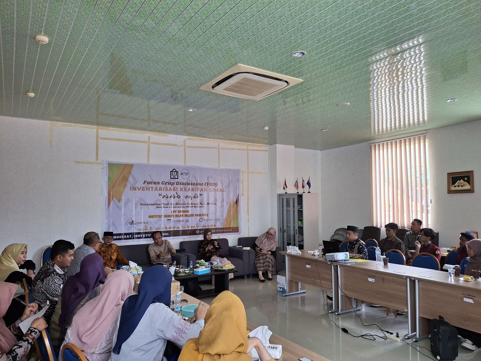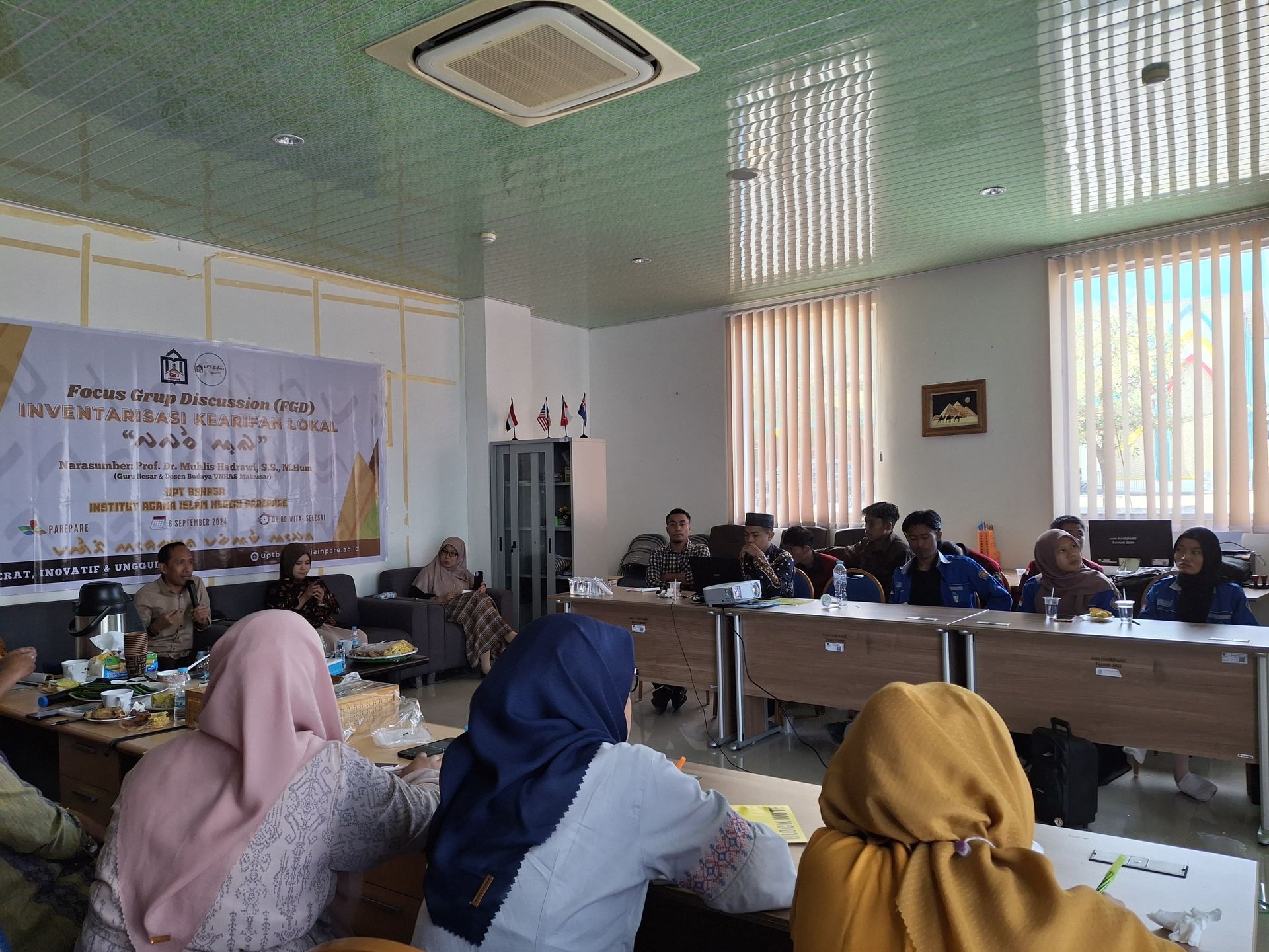 Sebagai bagian dari proses penyempurnaan, diadakan Focus Group Discussion (FGD) mengenai Inventarisasi Kearifan Lokal dengan menghadirkan dua pakar budaya. Prof. Dr. Muhlis Hadrawi, S.S., M.Hum., pakar budaya dari Universitas Hasanuddin (UNHAS), dan Rahmaniar, S.S., S.Pd., M.Hum., Ketua PPBDI Sulawesi Selatan. FGD yang berlangsung pada hari Jumat, 6 September 2024, di International Office IAIN Parepare, dihadiri oleh Wakil Rektor II, Tim Inventarisasi, Dosen, dan Mahasiswa IAIN Parepare.