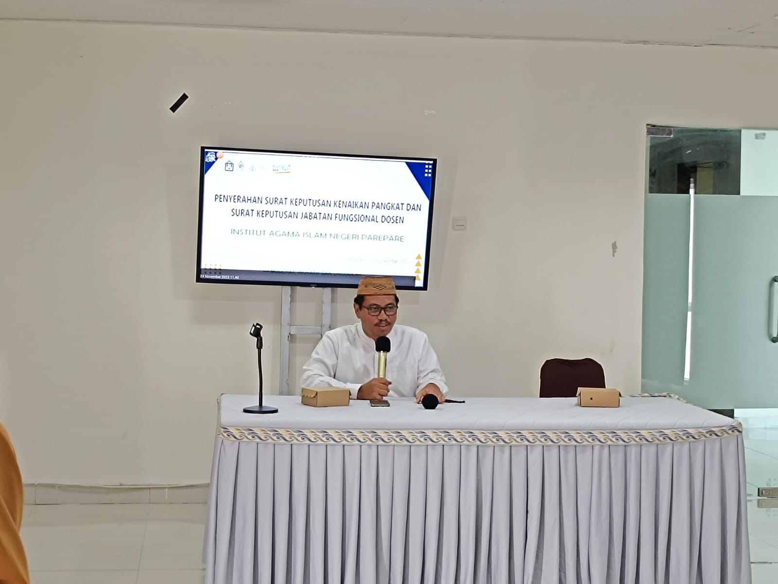 Humas IAINParepare-- IAIN Parepare terus berkomitmen dalam meningkatkan mutu dan kualitas para dosen dan tenaga Kependidikan. Hal ini dapat dilihat dengan dilaksanakannya penyerahan SK kenaikan pangkat dan jabatan fungsional dosen dan tendik. Sebanyak 17 dosen dan pegawai terlihat sumringah usai menerima SK, Jumat (24/11/2023).