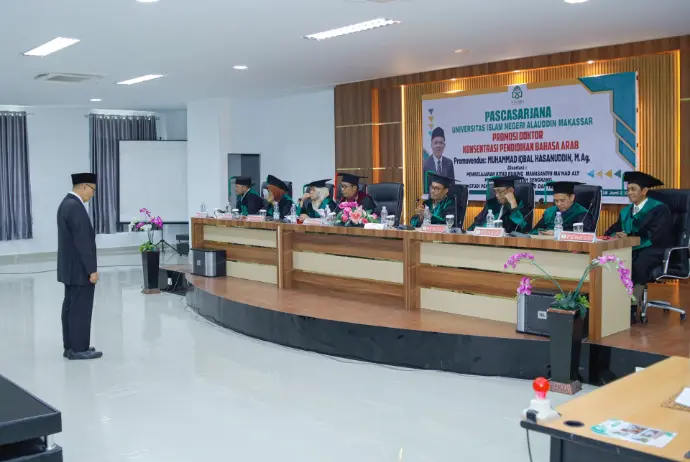 Sidang promosi ini dipimpin langsung oleh Wakil Direktur Pascasarjana UIN Alauddin Makassar, Prof. Dr. Hasyim Hadadde, M.Ag., selaku ketua sidang. Promotor Prof. Amran Kasim, Lc., M.A., Kopromotor Prof. Dr. Haniah, Lc., M.A., dan Prof. Dr. Andi Abdul Hamzah, Lc., M.A. penguji Prof. Dr. H. Syahruddin Usman., M. Pd. Prof. Dr. Erwin Hafid., Lc. , M. Th. I., M. Ed., dan Prof. Dr. Rappe. , M. Pd. I. , Pengujian Eksternal, Dr. Saepuddin., M. Ag