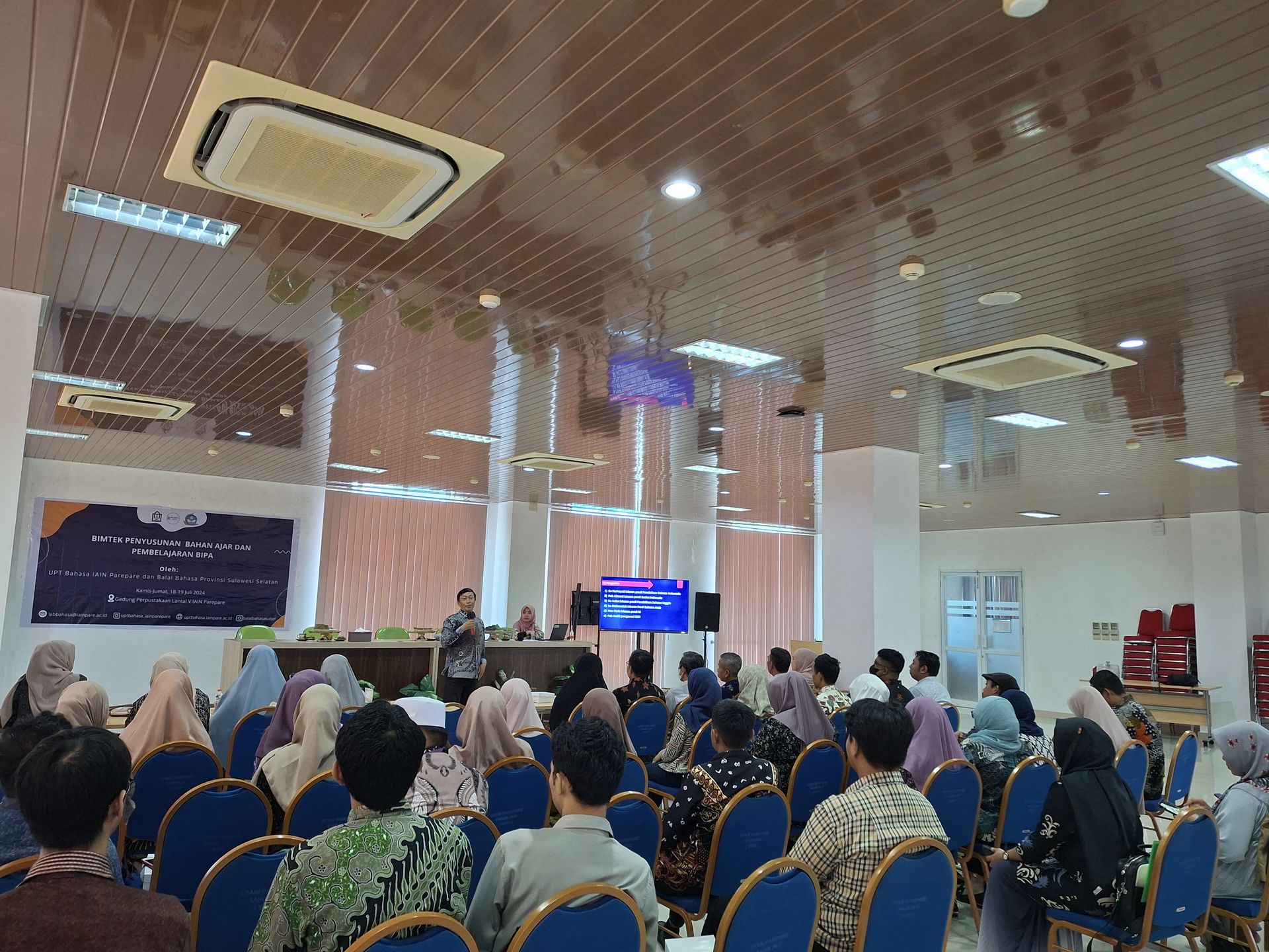 Humas IAIN Parepare---UPT Bahasa Institut Agama Islam Negeri (IAIN) Parepare menggelar kegiatan Bimbingan Teknis (BIMTEK) Penyusunan Bahan Ajar Bahasa Indonesia bagi Penutur Asing (BIPA) dan Pembelajaran BIPA. Kegiatan ini berlangsung selama dua hari berturut-turut di Ruang Seminar Lantai 5 Gedung Perpustakaan IAIN Parepare, yang dimulai pada tanggal 18 Juli hingga 19 Juli 2024.