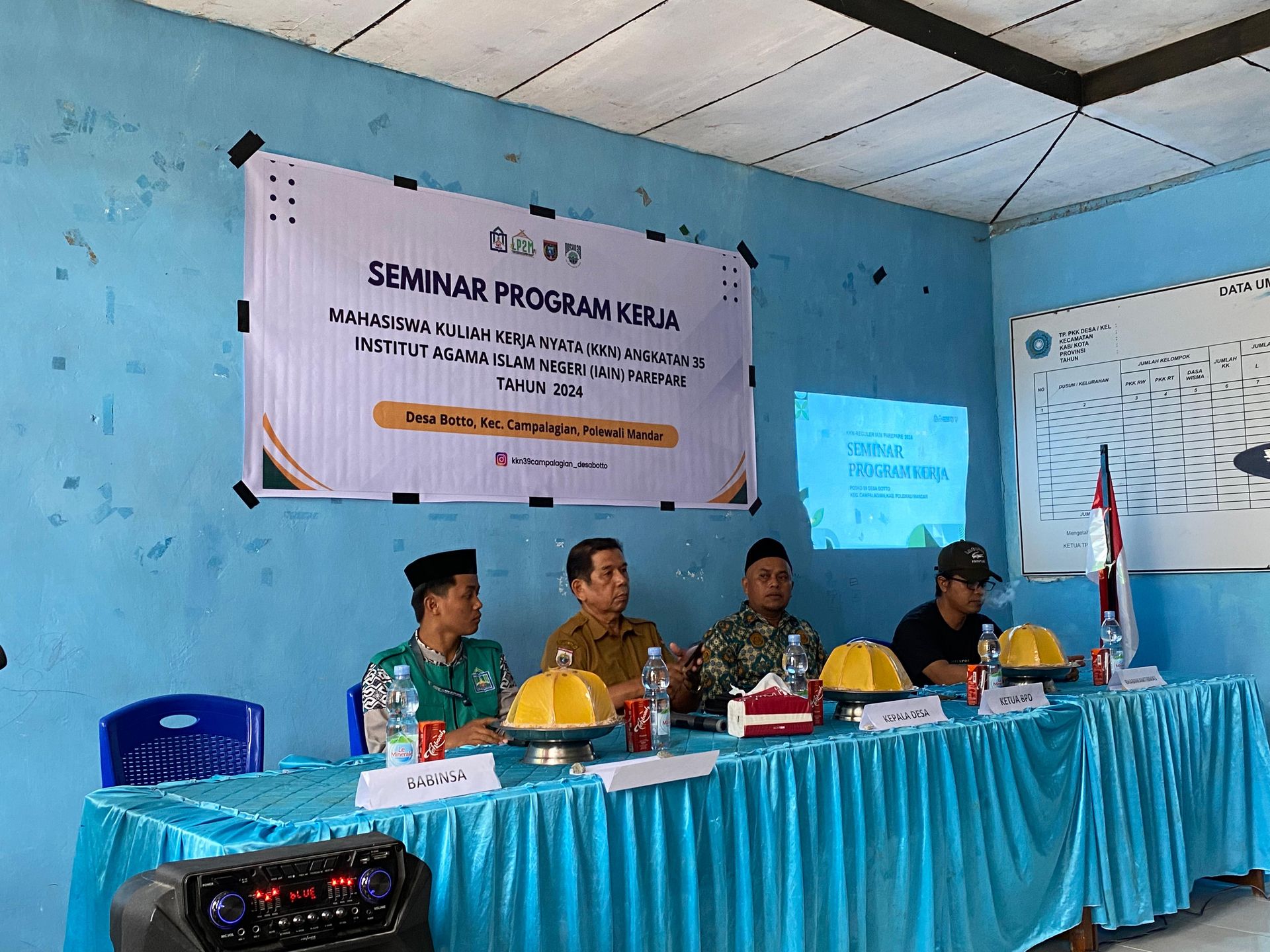 Humas IAIN Parepare---Mahasiswa KKN Reguler IAIN Parepare Posko 39 menggelar seminar program kerja pada Selasa, 16 Juli 2024, di Aula Kantor Desa Botto. Kegiatan ini bertujuan untuk membahas program-program kerja yang akan dilaksanakan dalam upaya meningkatkan kesejahteraan dan pembangunan desa.