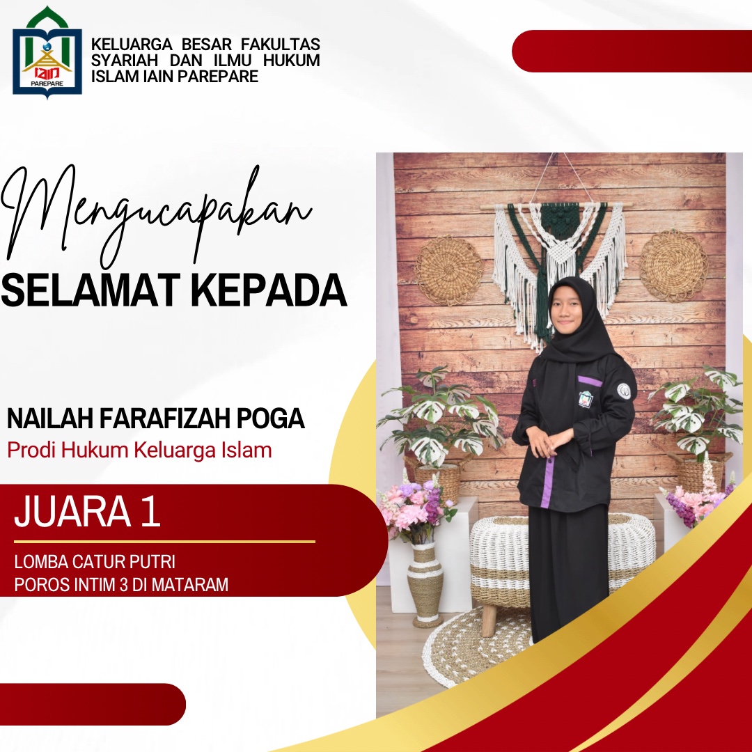 Humas IAIN Parepare -- Lima mahasiswa Fakultas Syariah dan Ilmu Hukum Islam (Fakshi) Institut Agama Islam Negeri (IAIN) Parepare meraih juara di Pekan Olahraga, Riset, dan Ornamen Seni PTKIN se-Indonesia Timur (Poros Intim) yang berlangsung di Kampus 2 UIN Mataram.
