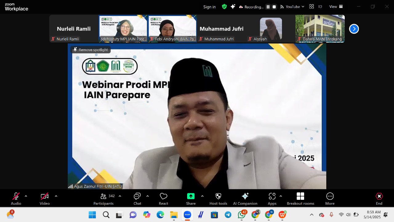 Webinar nasional ini menghadirkan tiga narasumber ahli di bidangnya, yaitu Mardia (Dosen Prodi MPI IAIN Parepare), Prof. H. Agus Zainul Fitri (Dosen Prodi MPI UIN Sayyid Ali Rahmatullah Tulungagung), dan Prayudi Lestantyo (Dosen Prodi MPI UIN Maulana Malik Ibrahim Malang). Diskusi dan pemaparan materi dari ketiga narasumber ini dipandu secara profesional oleh Ade Hastuty selaku moderator, memberikan wawasan mendalam mengenai tantangan dan peluang AI dalam pengelolaan pendidikan Islam. (irm/mif)