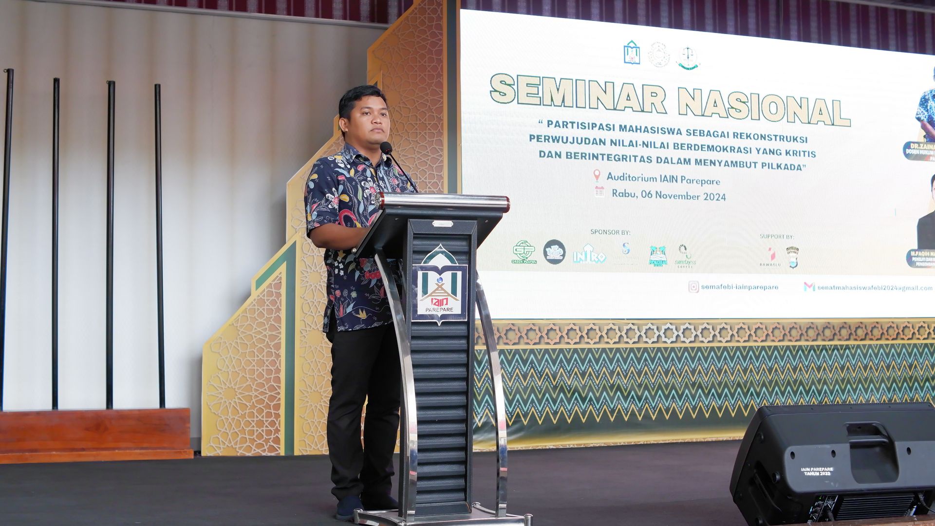 Humas IAIN Parepare-Senat Mahasiswa Fakultas Ekonomi dan Bisnis Islam (FEBI) IAIN Parepare menggelar Seminar Nasional bertema "Partisipasi Mahasiswa sebagai Rekonstruksi Perwujudan Nilai-nilai Berdemokrasi yang Kritis dan Berintegritas dalam Menyambut Pilkada". Seminar ini berlangsung di Gedung Auditorium IAIN Parepare pada, Rabu (06/11/2024), dan dihadiri oleh ratusan mahasiswa baik dari Fakultas Ekonomi san Bisnis Islam maupun dari fakultas lain.