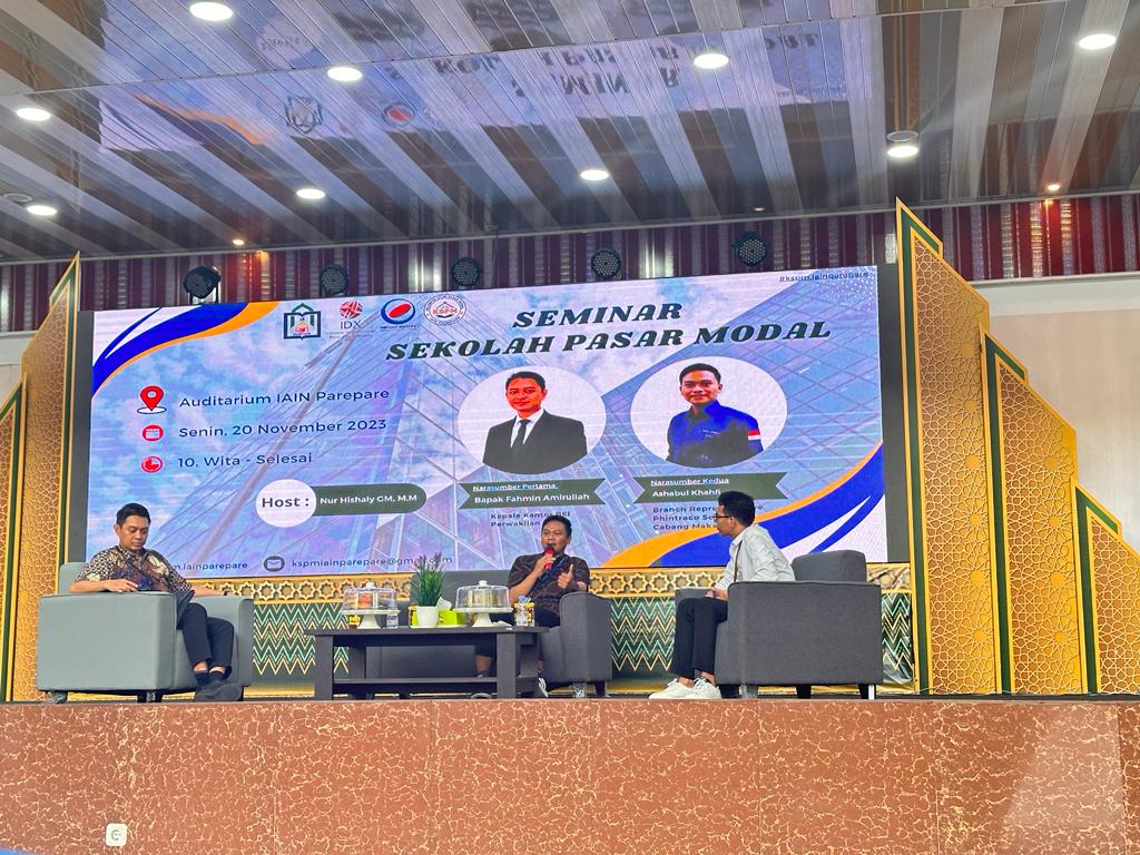 Humas IAIN Parepare--- IAIN Parepare melaksanakan kegiatan seminar sekolah pasar modal bagi seluruh mahasiswa penerima beasiswa IAIN Parepare, di gedung Auditorium IAIN Parepare, dengan menghadirkan dua narasumber yaitu Fahmin Amirullah, Kepala Kantor BEI perwakilan Sulsel dan Ashabul Khahfi Branch Representative Phintraco Sekuritas Cabang Makassar, Senin (20/11/2023).