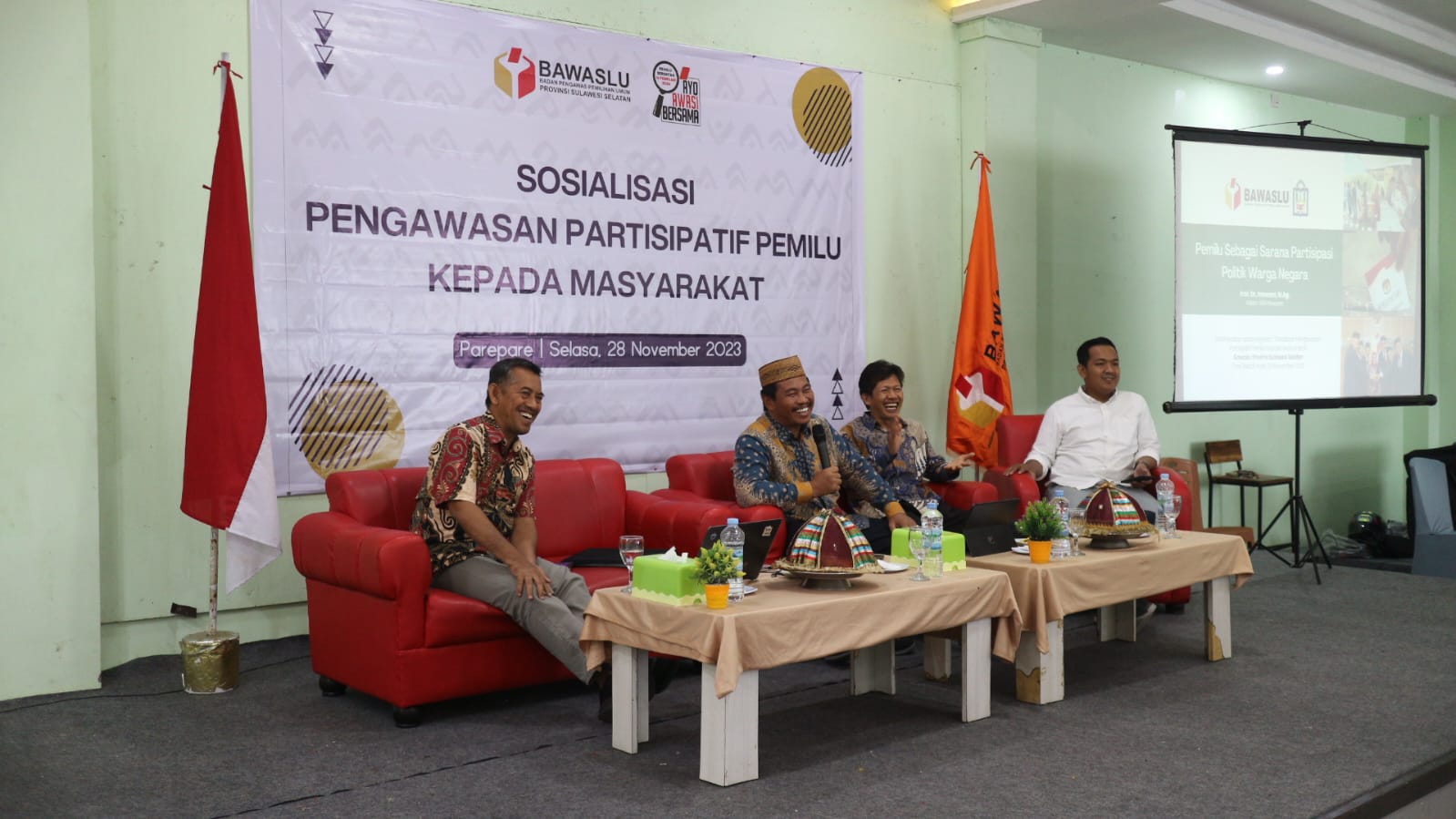 Humas IAIN Parepare - Badan Pengawas Pemilu (Bawaslu) Provinsi Sulawesi Selatan menggelar kegiatan Sosialisasi Pengawasan Partisipatif kepada Masyarakat Kota Parepare, Selasa (28-11-2023) di Hotel Platinum Parepare. Kegiatan tersebut dihadiri oleh Saiful Jihad dan Andarias Duma (Anggota Bawaslu Sulsel), Jalaluddin (Kepala Sekretariat Bawaslu Sulsel), Hj. Halwatiah (Staf Ahli Bidang Politik Hukum dan Pemerintahan Kota Parepare, mewakili Pj Wali Kota Parepare), serta unsur Forkompimda Kota Parepare.