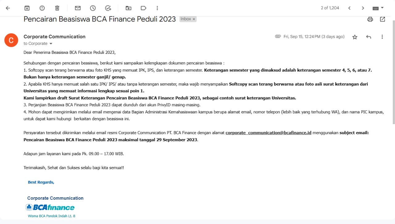 Untuk diketahui, Bank BCA mengadakan Program Beasiswa BCA Finance Peduli 2023 dengan memberikan bantuan dana pendidikan sebesar Rp 3.500.000 (Tiga Juta Lima Ratus Ribu Rupiah) per semester. Ini diberikan kepada mahasiswa aktif penerima beasiswa mulai semester 5 hingga maksimal semester 8 (Mhy/Mif).