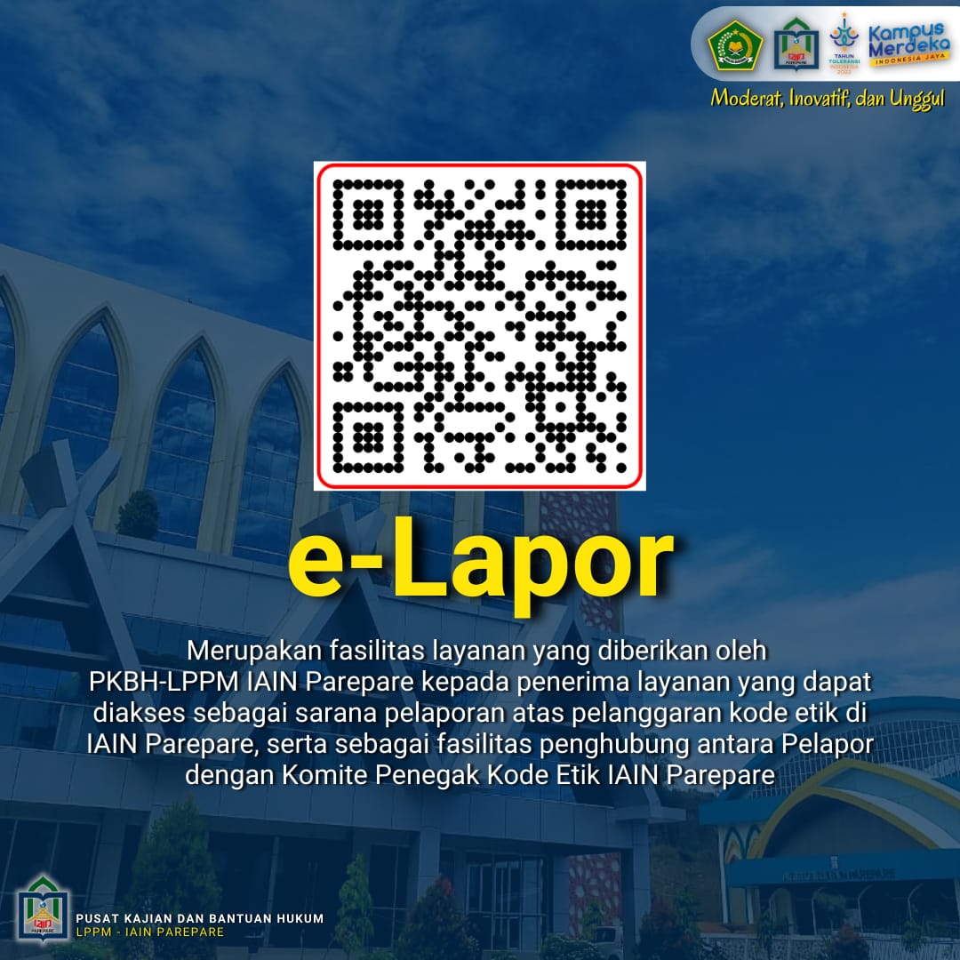 "Aplikasi E-Lapor dibuat sebagai komitmen penegakan kode etik dan mewujudkan zona integritas, yang telah dicanangkan oleh pimpinan institut. Ini merupakan fasilitas layanan yang diberikan oleh PKBH-LP2M kepada civitas akademika, yang dapat diakses sebagai sarana pelaporan atas pelanggaran kode etik di IAIN Parepare”, ungkap Azlan Kepala Pusat Kajian dan Bantuan Hukum IAIN Parepare.