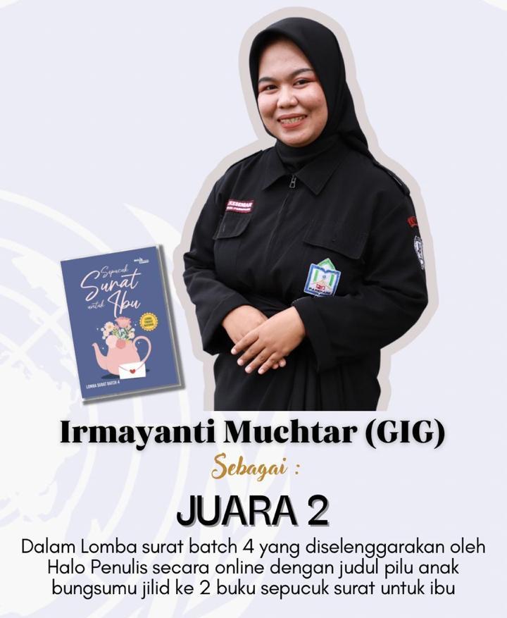 Irmayanti Muchtar, mahasiswa Fakultas Ekonomi dan Bisnis Islam, sekaligus sebagai Kepala Bidang Kesenian UKM Seni Animasi mengikuti lomba menulis tersebut dan ditetapkan sebagai juara kedua. Ia mengirim surat dengan judul “Pilu Anak Bungsumu”. Surat tersebut akan dimasukkan ke dalam jilid kedua buku Sepucuk Surat untuk Ibu