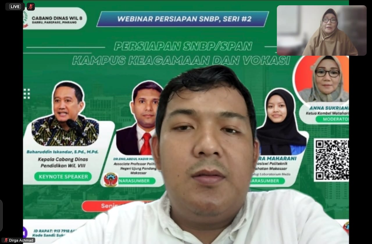 Dirga Achmad, Kepala Pusat Admisi IAIN Parepare, menjadi salah satu pembicara utama dalam webinar ini. Dirga memaparkan berbagai keunggulan IAIN Parepare sebagai salah satu Perguruan Tinggi Keagamaan Islam Negeri (PTKIN) yang terus berkembang. Ia menyebutkan bahwa IAIN Parepare kini memiliki fasilitas modern, kualitas pendidikan yang kompetitif, serta lulusan yang mampu bersaing di dunia kerja.