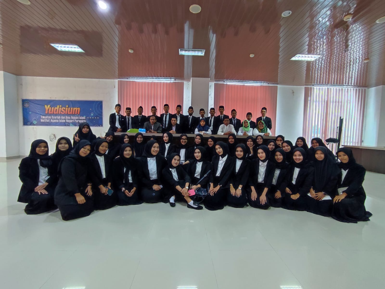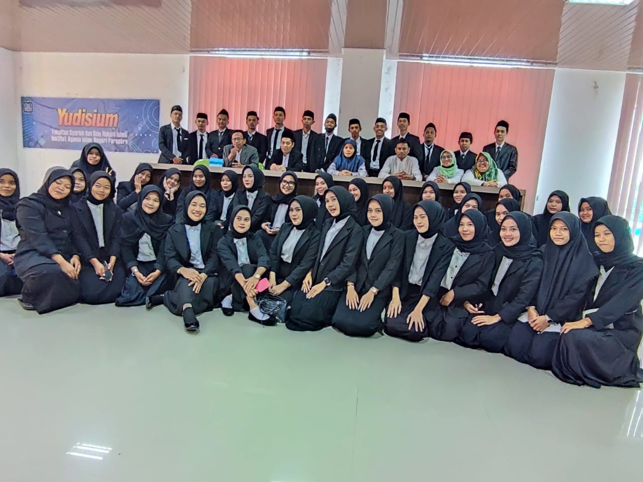 Yudisium yang sebelumnya hanya dihelat di gedung Fakshi, diadakan di ruang yang lebih besar dikarenakan membeludaknya mahasiswa yang akan diyudisium yakni 156 orang (28 orang Prodi Hukum Keluarga Islam, 46 orang Prodi Hukum Ekonomi Syariah, 37 orang Prodi Hukum Pidana Islam, dan 25 orang Prodi Hukum Tata Negara). Hadir pada kegiatan tersebut Dr. Rahmawati, M. Ag. (Dekan Fakshi ) sekaligus membacakan Berita Acara Yudisium, Dr. Aris, S. Ag.,M. H. I. (Wakil Dekan I) sekaligus membacakan Surat Keputusan Dekan, Dr. Fikri,S.Ag.,M.H.I.(Wakil Dekan II), Nurmi, M. Ag. (Kabag Fakshi), serta para ketua prodi lingkup Fakshi.